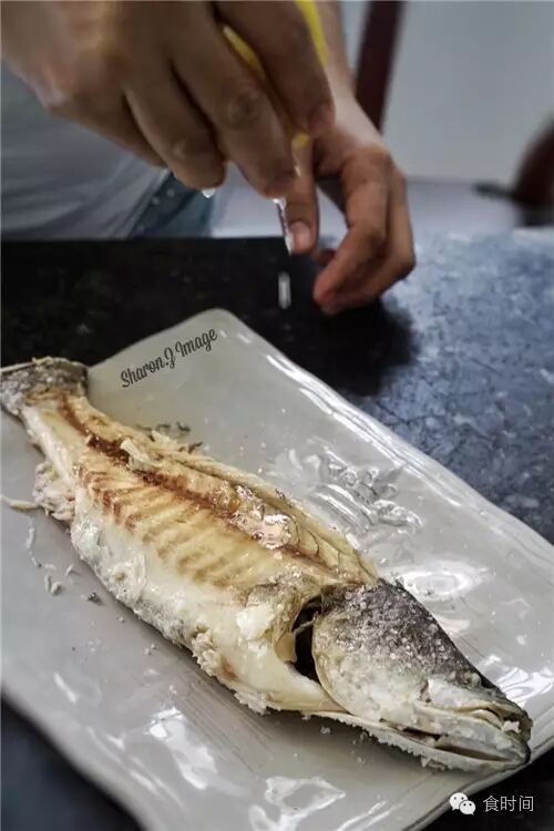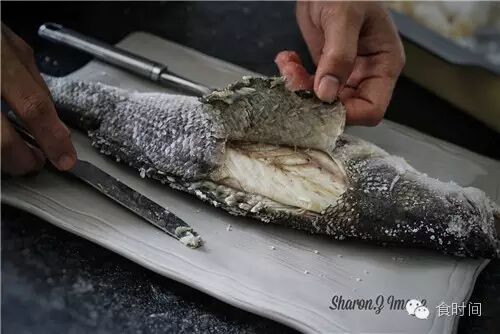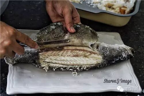 6:烤好后盐会变硬,拿勺子敲开,去掉盐,从鱼背处轻轻把鱼皮揭开,去除全部鱼皮,挤上柠檬汁,即可享用。
