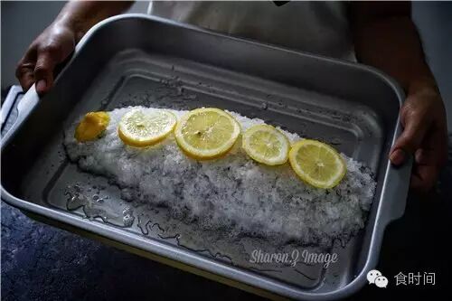 4:烤盘先倒入一点盐垫底,放上鱼,然后把盐均匀的盖在鱼身上,直到把鱼全部包起来,完全不外露。